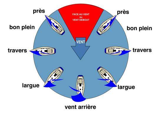 Ci-dessous image représentant les différentes allures du bateau en fonction de la direction du vent